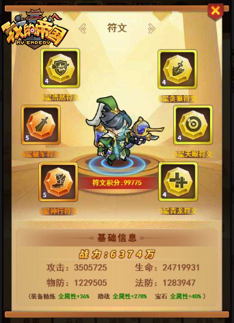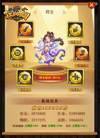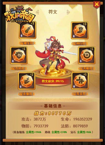 在游戏中,为主公提供了丰富多种的符文类型,他们属性各不相同。例如攻击、闪避、生命、抗爆、暴击和命中等属性。主公可以根据自身武将的前后排阵容,以及他们的天赋属性来为其搭配合适的符文,扬长避短补己身之不足。同时,符文还可以进行升级和进阶,进阶后的符文属性会获得巨大提升。