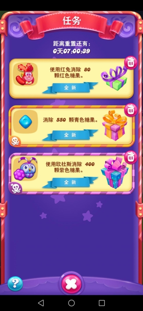每天各位玩家可以完成一共三个日常任务,这些任务的难度由易到难从上往下依次排列,如果你觉得哪个任务难度过高或者不符合你的口味,还有一次更换日常任务的机会,点击任务右上角的清理标志即可。因为每天刷新日常任务的机会只有一次,所以你必须合理规划自己的任务清理顺序,同时想想你所擅长的好友们它们都有哪些能力,记住试着在冒险中与好友技能相互配合永远是糖果世界不变的通行证。
