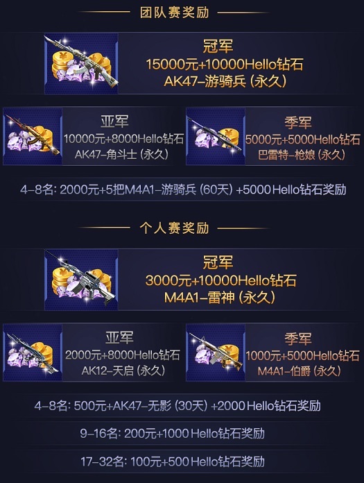 本次赛事将为成功报名的个人/团队送出游戏道具M4A1-竞技战魂(1天)+战队印花|CFML2020*3+洛伊10积分卡*1 ,奖励CDK将于7个工作日内发放到Hello语音消息,请登录APP消息——Hello通知查收。
