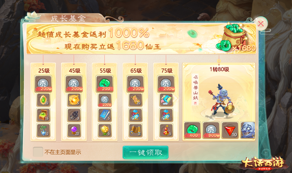 在新服开启后,玩家可以花费1680仙玉购买【成长基金】,购买后立返1680仙玉,并且玩家只要角色达到指定等级都可以领取相应的好礼,从银两、帮贡、宝石到召唤兽、技能书应有尽有,礼包总返利预估达到1000%,真正伴随着大家一路成长!