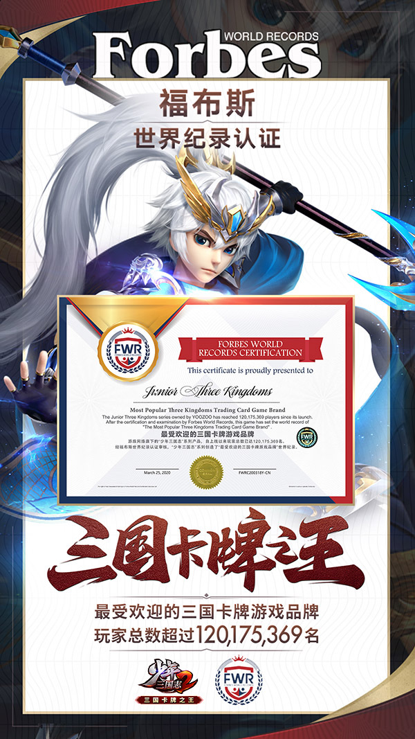 “少年三国志”品牌由《少年三国志》《少年三国志2》两款产品组成。其中,《少年三国志》在5年间累积吸引了逾1亿玩家,是当之无愧的三国卡牌领航者!而12月11日全平台上线的《少年三国志2》,更是运营4个月就吸引了超过2000万玩家!它在各大应用商店长期占据游戏榜前5,也创造了同类产品的榜单记录!亿万少年共同创造的成绩,自然不怕检验,在福布斯世界纪录官员的认证下,“少年三国志”系列成功创造了福布斯【最受欢迎的三国卡牌游戏品牌】世界纪录,正式加冕为三国卡牌之王!