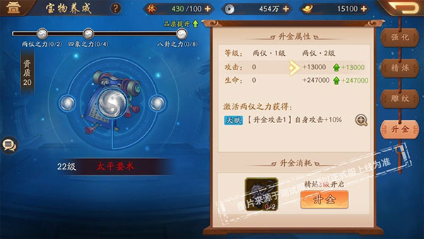 《少年三国志2》王者版本不止有定军山上的5V5大战,还有帮助少年们快速提升阵容强度的“升金”玩法上线!新版本中,65级以上的少年都能通过“升金”功能将原有的红色宝物进化至金色。升金过程共有3个阶段,每个阶段完成后宝物都将获得额外的天赋属性,终阶淬炼完成后更能实现品质进化,迈入金色至宝的殿堂,获得大量基础属性的提升,让武将如虎添翼!