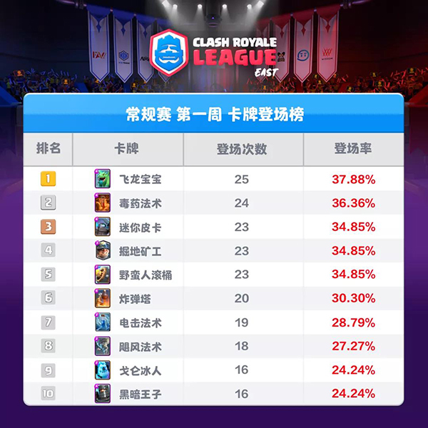 首周卡牌登场榜,万金油飞龙宝宝登顶,不论是在双龙平推还是墓园体系中,龙宝都是关键辅助。毒药和矿工分列第二、第四,一个是万能法术一个是百搭核心。切后排之王小皮卡高居第三,版本之子诚不欺你。其他前10中,滚桶、小闪和飓风都是关键法术,炸弹塔则是皇家猪的克星,冰人在皇家猪卡组中充当重要角色,黑王则靠全面的能力挤进前10。