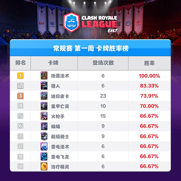 首周卡牌胜率榜,6战6胜的地震高居第一,防守神卡猎人位列第二,二者都是地震皇家猪体系的重要组成部分。其他上榜卡牌,小皮卡、机甲、女枪、超骑和电龙也都是防守能力S级的卡牌,职业赛场稳健第一。蝙蝠在小费体系中如鱼得水,大闪靠着豆豆的石头人和经典的绿胖开车胜率飙升,重获新生的治疗精灵则在处子秀就杀进胜率前10。