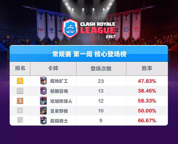 核心卡牌必须单拿出来讲一讲,首周,矿工虽遭削弱依然是最稳核心,配合推进、炸弹人、天狗或者自成毒矿都经典好用。墓园则在新赛季大放异彩,防守稳到不行的龙骑墓园太适合职业舞台。矿工炸弹人从秋季赛一路火到现在,小费高手们对其爱不释手。皇家野猪也在增强后重回视野,地震皇家猪和三枪皇家猪均有登场。最后则是超骑,CR一哥已取代了大皮卡(登场1次)防反核心的地位。