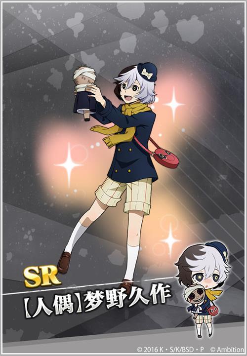 卡面立绘极具冲击力,梦野久作天真无辜的眼神搭配身后的异能人偶,看似人畜无害,又仿佛在下一时刻就要释放强大的幻觉异能。这张卡将开启限定概率UP扭蛋,喜欢的小伙伴要记得抽取哦。
