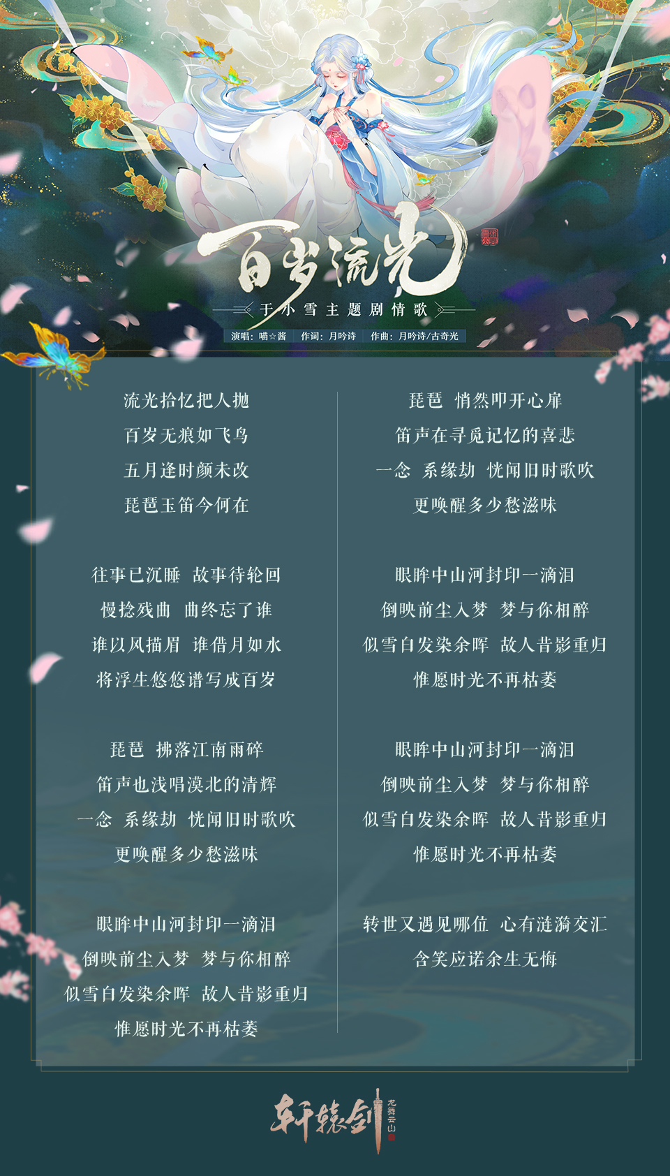 由古风音乐人月吟诗、古奇光创作,知名歌手喵☆酱倾情献唱的于小雪主题剧情歌《百岁流光》,今日正式上线网易云音乐。该剧情歌的前奏以《百岁流光》主题诗作为清唱引子,在歌手的轻声哼唱中将侠士们带入于小雪的内心世界。