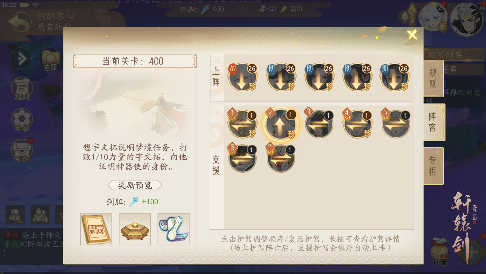 完成每一关卡后还将得到对应数量的“琴心”,可在宇文拓处兑换丰厚奖励,增强战力,再度心劫。
