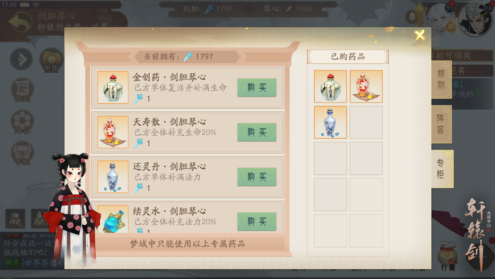 为助力禁制伏羲琴的战斗,副本将开放专柜出售“剑胆琴心”专用药品,少侠可通过赢得战斗获取“剑胆”进行兑换。除了针对状态回升的药物,还有可以转换己方队伍属性的道具可以选择,为鏖战提供了更多的可能性。