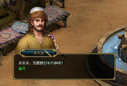 然后我们再来说一说西域古城,在这个地图中,最出名的小摊应该就是羊大叔的烤羊肉串啦。在这里买上几串羊肉串,坐在西域古城难得的喷泉边上,看看古城中的帅哥、美女,好不惬意!另外一个西域古城中的摆摊NPC就是兵器铺的阿萨铁匠了。与揽仙镇或者天墉城不同,古城中天气炎热,人们无法在室内锻造武器。因此,阿萨铁匠索性就在室外摆起了摊位,将锻造过程展示给所有人,而这样一个简单的举动,反而使他家的武器广受欢迎。