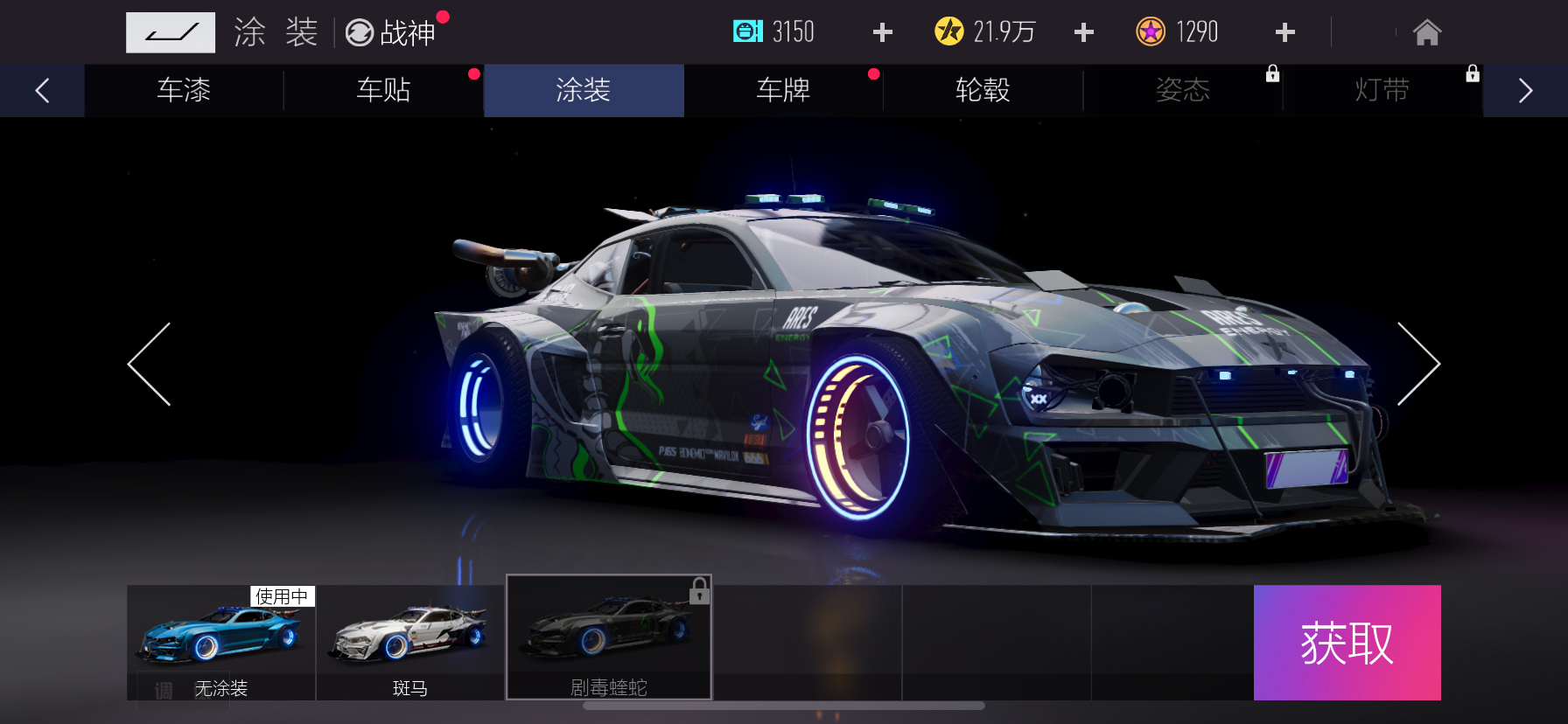 《王牌竞速》还为许多车辆精心设计了涂装。与车漆不同,每个涂装都有自己独特的“主题”,除了车体漆色改变外,还添加了许多紧扣主题的设计元素,以战神的“剧毒蝰蛇”涂装为了,灰黑的底色兼顾力量与沉稳,蝰蛇等元素符号的加入让赛车颜值爆表!
