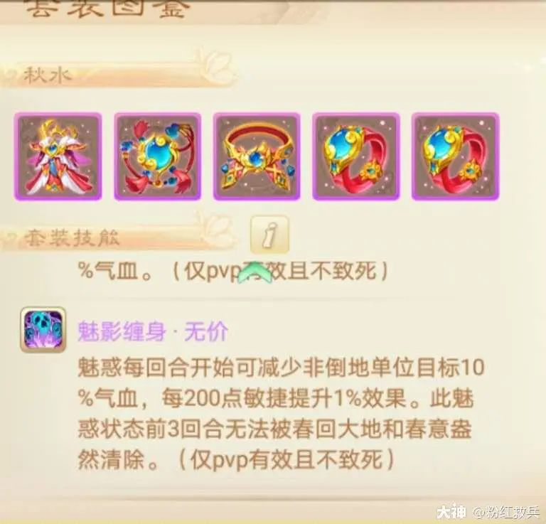 在这里救兵针对大部分平民玩家角度推荐女鬼装备选择鬼火魅惑,两个原因(经济、实用)首先魅惑的强度对于装备的依赖并不大,但是在效果上特别的显著。你只需要半三阶水平就可以有很高的效率,另外配饰选择上也基本可以锁定霄汉跟秋水,可以根据你自己在队伍角色,切换不同配饰。也不需要硬要走超敏或者负敏,只需要能出手就能带来效果,救兵目前玩的平民小女鬼就过得很滋润,不单颜值爆灯,还能很好的配合各种队伍。