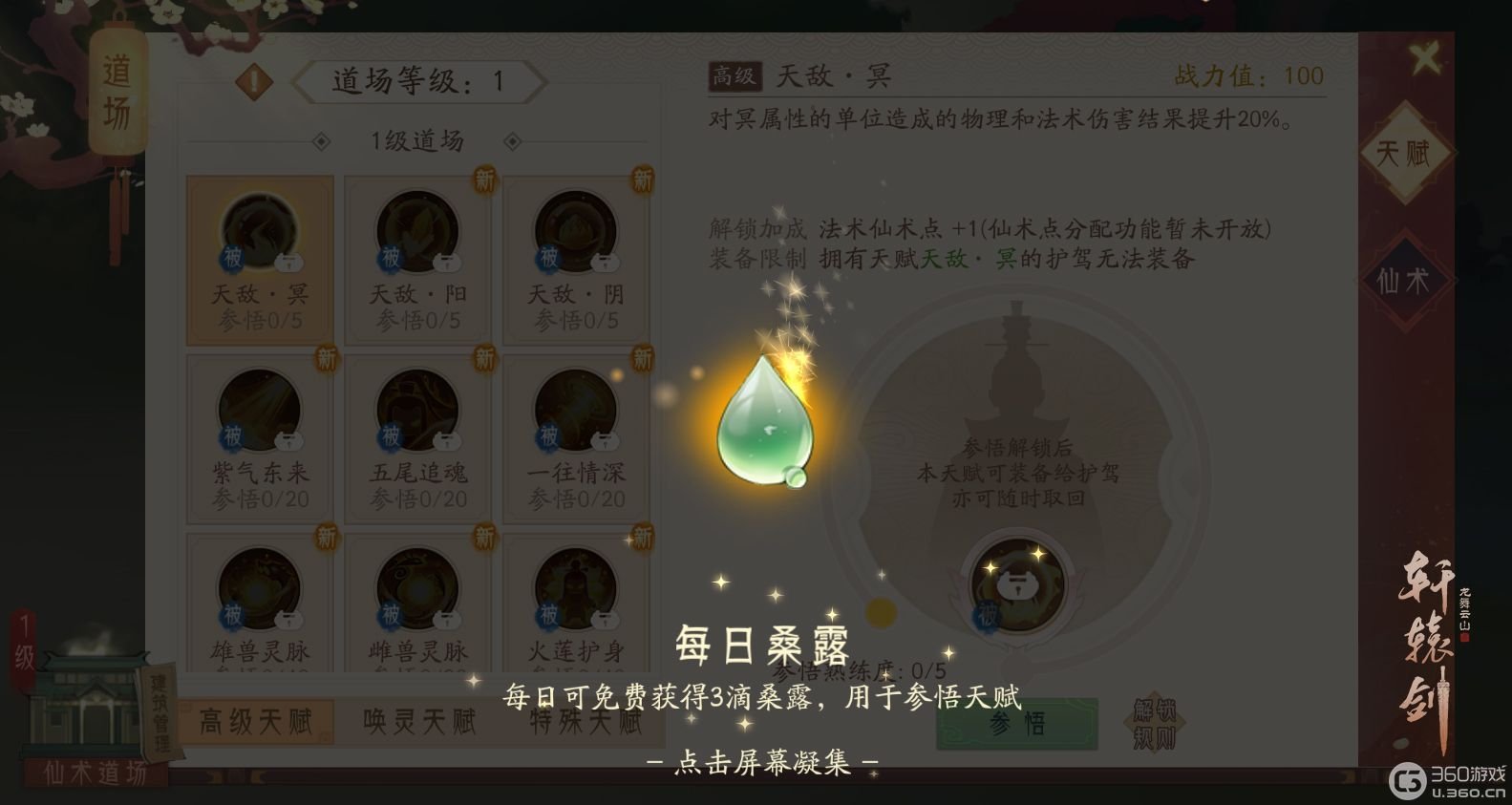 侠士们可每日免费领取“桑露”道具进行修炼。选择指定的天赋技能进行参悟,解锁后的技能可装配给其他护驾使用。“仙术道场”将为技能提供繁多的搭配可能,给战斗创造多样的策略选择!