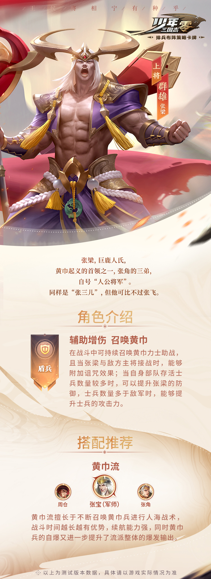 布阵有道,兵将皆有可为!《少年三国志:零》是游族网络即将推出的多阵容策略卡牌手游,自曝光以来, 4x4方阵布局与去回合制的独特玩法就引发卡牌玩家与策略游戏爱好者们的密切关注。在游戏中,玩家可以集结三国知名英豪,根据角色特点进行阵容搭配,发挥每个武将的独有实力。今天,就为大家带来经典“黄巾流”中的核心之一——「人公将军」张梁的独家情报。