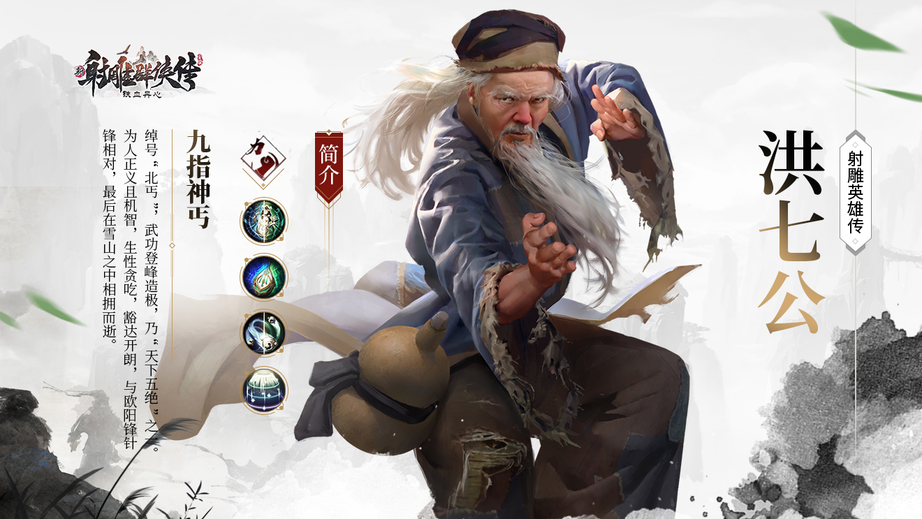 武学上,洪七公凭藉高超武艺在华山论剑中获得“北丐”称号。生平习得降龙十八掌、打狗棒法、逍遥游、漫天花雨撒金针、九阴真经等强力武功,使其继续成为武林第一大帮,率领丐帮抗击金兵。在《新射雕》手游中,洪七公即作为传奇的稀有侠客,加入到玩家的阵容,定位是分摊敌方的伤害,是一个攻守兼备的强力角色。