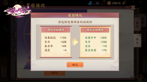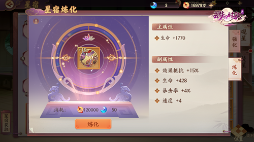 在新版本中,星宿炼化功能上线了!当灵主大人等级达到35级时,即可开启星宿炼化功能。选中星宿的等级达到15级,即可通过主界面的“星宿-强化-炼化”进行炼化。星宿炼化可以将等级+15星宿的副属性重新生成,得到全新的副属性,主属性不变。星宿炼化需要消耗炼星石和通宝,其中炼星石可以通过四灵阵副本获取哦。