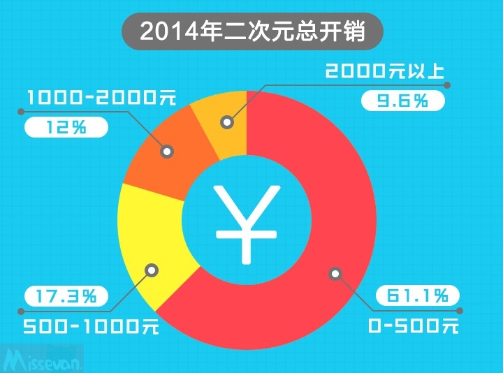 据漫画帮统计,2014年度二次元群体人均开销在500元以内的占比61.1%,500-1000元的占比17.3%,1000-2000元的占比12%,而花费超过2000元以上的仅占比9.6%。