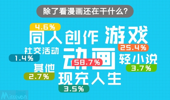 漫画帮本次数据报告,还针对用户除了看漫画以外的其他娱乐方式进行了调查。从结果中可以看到超过58.7%的用户选择看动画,25.4%的用户选择玩游戏。
