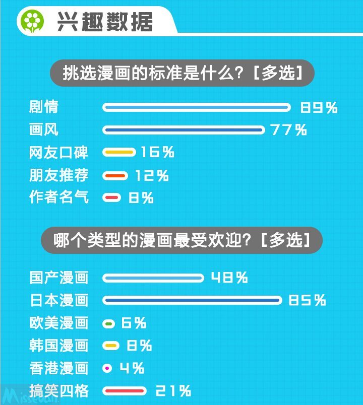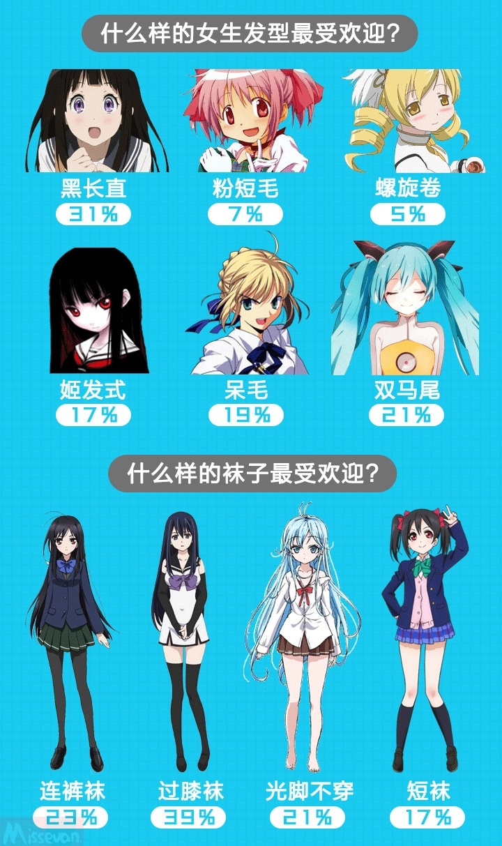 在本次调查中,漫画帮也做了一些有趣的数据分析。黑长直、双马尾、呆毛和姬发式的女生发型是最受二次元群体青睐的。连裤袜、过膝袜(绝对领域)是最喜欢的袜子属性。相信这也可以在一定程度上提供各位正在进行动漫相关创作的从业者们一些设计思路。