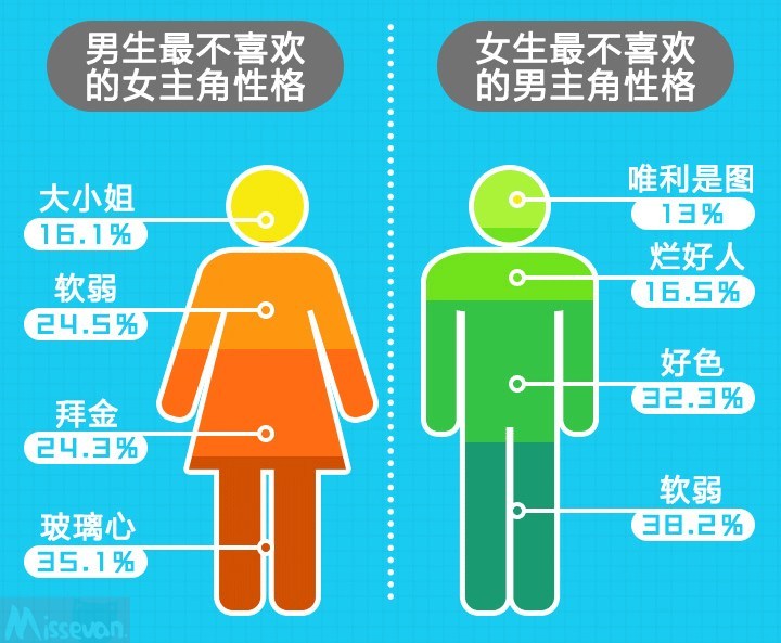 男生最不喜欢女主角的四大性格分别是:玻璃心、拜金、软弱和大小姐性格;女生最不喜欢男主角的四大性格:软弱、好色、滥好人和唯利是图。