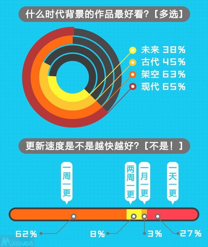 在针对作品世界观喜好的调查中,超过一半的用户喜欢现代或架空题材的漫画作品。而在更新周期上,受日漫影响希望周更的用户最多,这也给国内的漫画创作者提出更大的挑战。
