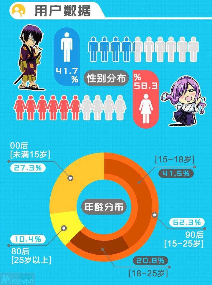 在本次调查报告中,二次元男性用户占41.7%,女性占58.3%。从近年来腐文化的盛行以及新作品越来越偏向轻松诙谐、萌腐兼备的日常向也可以看出趋势的变化。此外,大众向的游戏快速发展,抢占了宅男原本在动漫领域里的时间和空间。