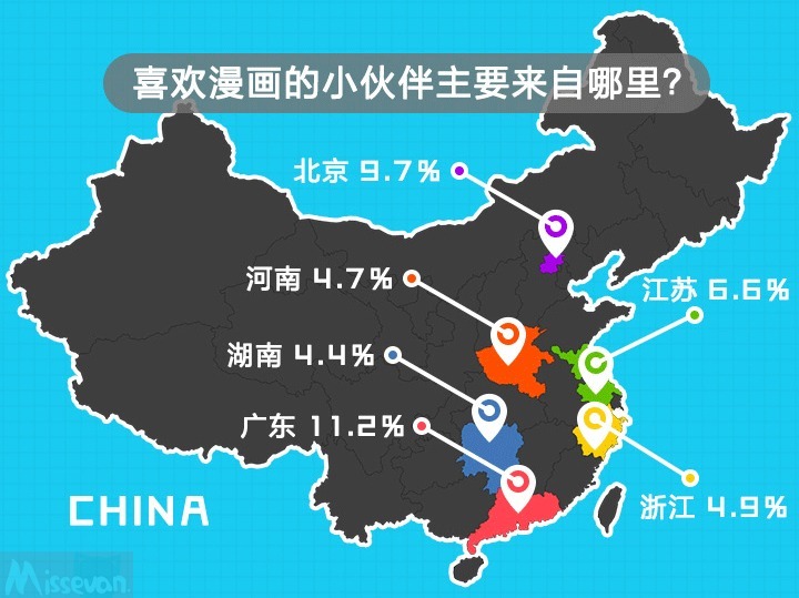 年龄层面上90后占据了62.3%的市场份额,00后也有将近3成的比例。虽然近几年动漫市场发展火爆,但是主流受众仍然集中在青少年群体。相比日、美动漫用户全年龄层的活跃,国内中青年用户大幅流失的现象值得我们反省与深思。