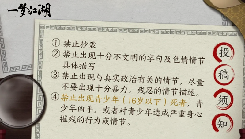 在《一梦江湖》手游中,有许多创作元素值得挖掘:武功高强却各具特色的八大门派、身怀绝技且饱经世故的NPC、故事感满满的各个地点……本次征稿活动,要求以《一梦江湖》游戏背景或《一梦江湖》游戏衍生元素进行衍生创作剧本杀剧本,不要偏题哦!