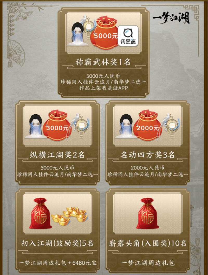 在本次剧本杀征集活动中,少侠不仅可以创作自己精彩的剧本,还有机会赢得超多奖励哦!一梦江湖与我是谜APP共同为大家准备了丰厚的大奖。奖品中不仅包括精美周边礼包,珍稀同人挂件,还有丰厚的现金奖励!只要你的剧本逻辑缜密、有亮点有创意,就有机会获得这些奖品!如果少侠的剧本获得大家的一致认可,还有机会上线我是谜APP,获得百万曝光资源!心动了吗?那就快来释放你的才华吧!