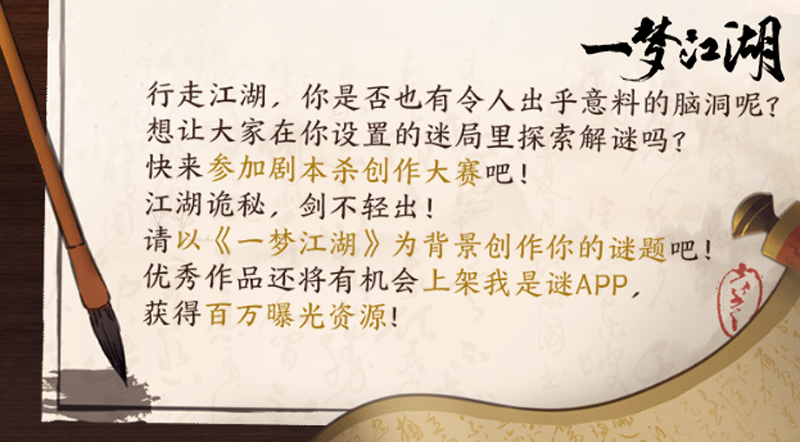江湖诡秘,剑不轻出!行走江湖,你是否也有令人出乎意料的脑洞呢?想让大家在你设置的迷局里探索解密吗?快来参加《一梦江湖》与我是谜APP共同举办的剧本杀创作大赛吧!少侠只需以《一梦江湖》为背景打开脑洞,创作你的谜题。优秀作品将有机会上架我是谜APP,赢得百万曝光资源。
