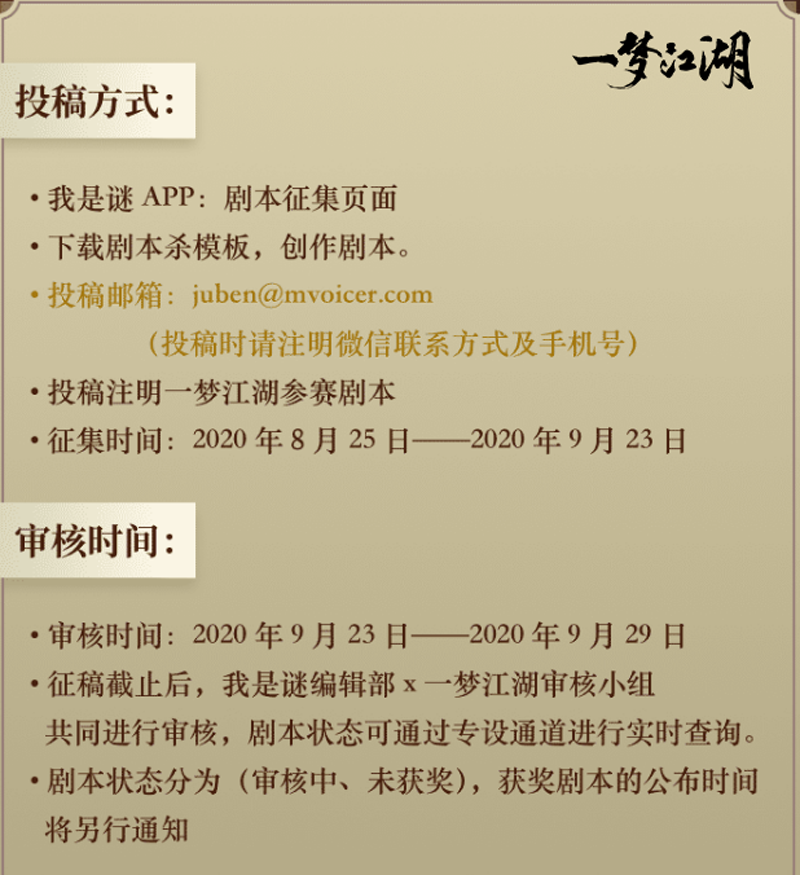 想要参与剧本杀征集活动的少侠,可以前往我是谜APP的剧本征集页面上传作品。也可以将作品发送至投稿邮箱:juben@mvoicer.com,并注明一梦江湖参赛剧本即可参赛。无论以哪种方式参赛,少侠都需要注明微信联系方式及手机号哦!本次活动征稿时间为2020年8月25日到2020年9月23日,感兴趣的少侠不要错过时间啦~