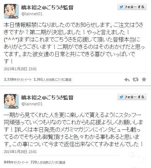 此前我们才报道了TV动画《请问您今天要来点兔子吗》第二季制作决定,以及STAFF方面,已公布的主要制作人员名单均采用原班人马,监督、系列构成、动画人设依然分别由桥本裕之、笔安一幸、奥田洋介担当,音乐依旧交由川田瑠夏创作,而摄影监督则依然是峰岸健太郎。CAST方面,佐仓绫音、水濑祈、种田梨纱、佐藤聪美、内田真礼仍旧领衔,德井青空、村川梨衣、早见沙织、清川元梦、速水奖也还是会参与第2季的配音工作。
