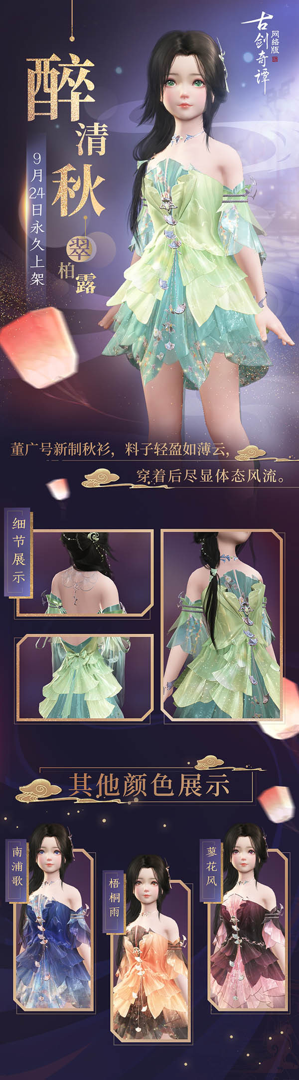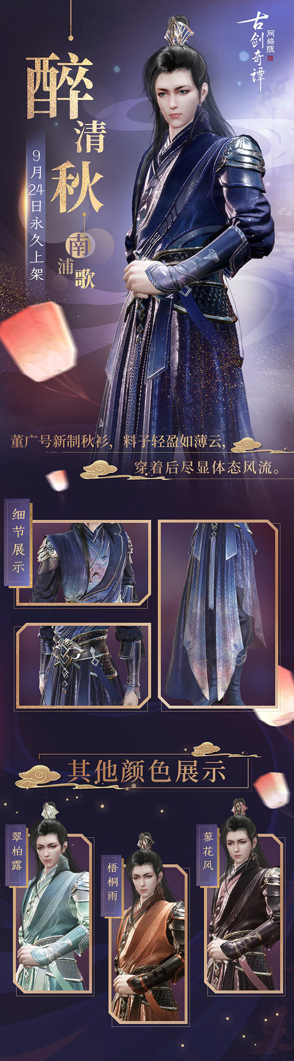 龙星商会的成立日近在咫尺,又恰逢中秋佳节,龙星商会花大力气派遣两队人马:一路成衣匠跨越山海寻访故人,依其服饰形貌绘制图谱;一路踏遍神州清秋,为壮阔秋景所感动,制成“醉清秋”系列外装。