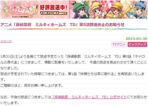 ISIS绑架两名日本人的事也差不多有两周的时间了,日本国内高度关注事件的进展同时一些涉及到绑架、人质的电视节目也纷纷自律,像上周「暗杀教室」第三话停播,凛与时雨更改歌曲中含有暴力的歌词,今天和人质事件八竿子打不着的「侦探歌剧少女福尔摩斯TD」也宣布第四季第五话本周停播!!用得着这样子???