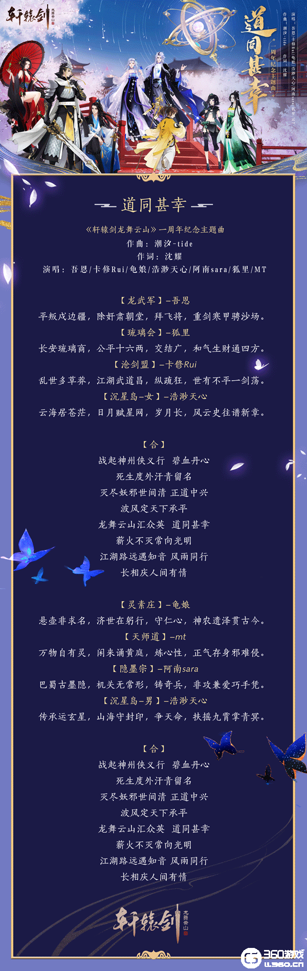 《道同甚幸》由知名古风音乐团队“异新音乐”制作,作曲家潮汐-tide和词作沈耀联合打造,特邀吾恩、卡修Rui、龟娘 、浩渺天心、阿南sara 、mt、狐里七位实力歌手倾情献声。游戏经典原声融入高燃旋律,笛音箫韵间可闻刀剑出鞘,潇洒非常,尽显轩辕世界侠者豪情。