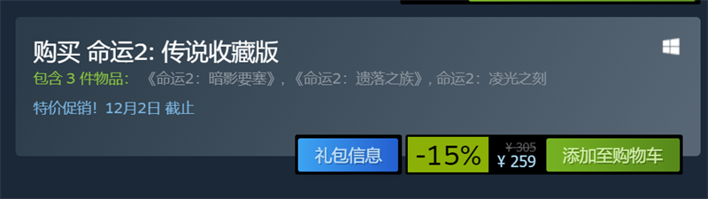 同时,《命运2:传说收藏版》限时85折,只需259元即可一次享受《命运2:暗影要塞》、《命运2:遗落之族》、《命运2:凌光之刻》三大游戏资料片精彩内容,感受游戏庞大的世界观,在深空之中,邂逅新的惊喜!