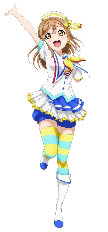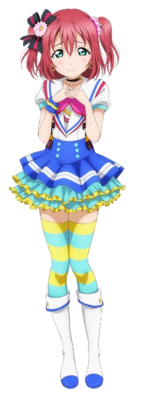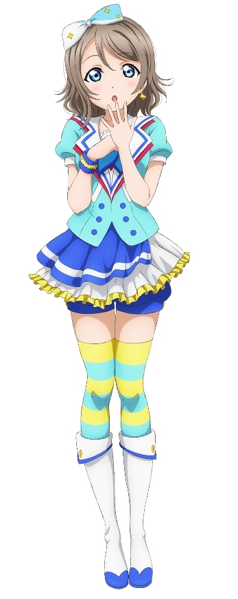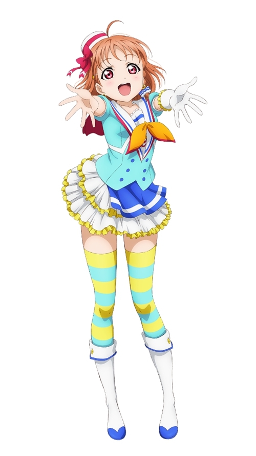 高海千歌,浦之星女学院的二年级生,Aqours的发起人,属于小队CYaRon!。千歌是家中三姐妹中年纪最小的,家中经营日式旅馆。待人亲切,个性好强。以天生开朗与强硬的性格,千歌将身边的人接连卷入自己的行动之中。因追逐在μ's的演唱会中所感受到的“光芒”而对学园偶像产生兴趣,并创立了Aqours。