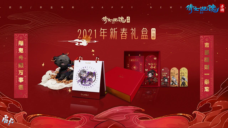 迎新春,贺新禧。新春佳节将至,倩女手游邀你置办年货啦!今晚19:30,倩女幽魂手游【倩意年货节】正式开启,新春台历礼盒99元包邮限时出售(限量500份):2021年精致台历伴你过新年,游戏内24个角色齐亮相;迷你对联寓意吉祥,运开时泰为新年增福添喜;购买新春台历礼盒,获新年红包(含500绑定灵玉);5款角色红包袋画风精美,助力牛年财运亨通紫气东来。值此辞旧迎新之际,倩女开发组诚挚感谢玩家整年的相伴相守。新的一年,倩女幽魂手游将与你携手开启全新篇章。三界同游,你我精彩继续。