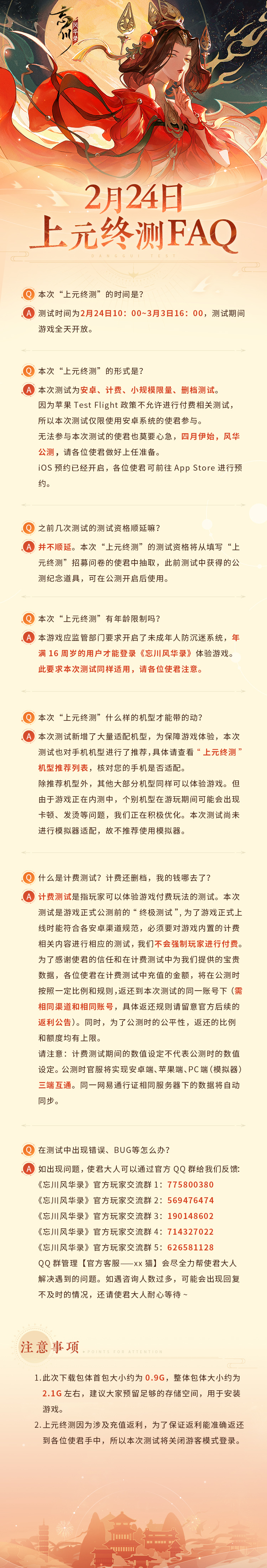 上元终测的测试时间为2月24日10:00-3月3日16:00,测试期间游戏全天开放。本次测试为安卓、计费、小规模限量、删档测试,所有玩家“使君”需要重新获得本次测试资格,往期测试资格在本次上元终测中将无法再次使用。