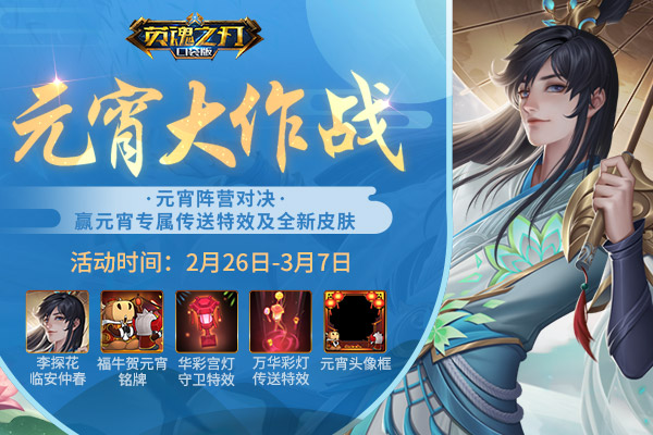 2月26日-3月11日,玩家自选加入咸香元宵队或甜蜜汤圆队,每日通过登录、分享、对局点赞、消耗金币、累计排位胜场等方式,就可获得糯米值。活动结束后,累计糯米值多的阵营即可胜出。快快参与到全新的“元宵大作战”中,捍卫自己喜爱的口味吧!