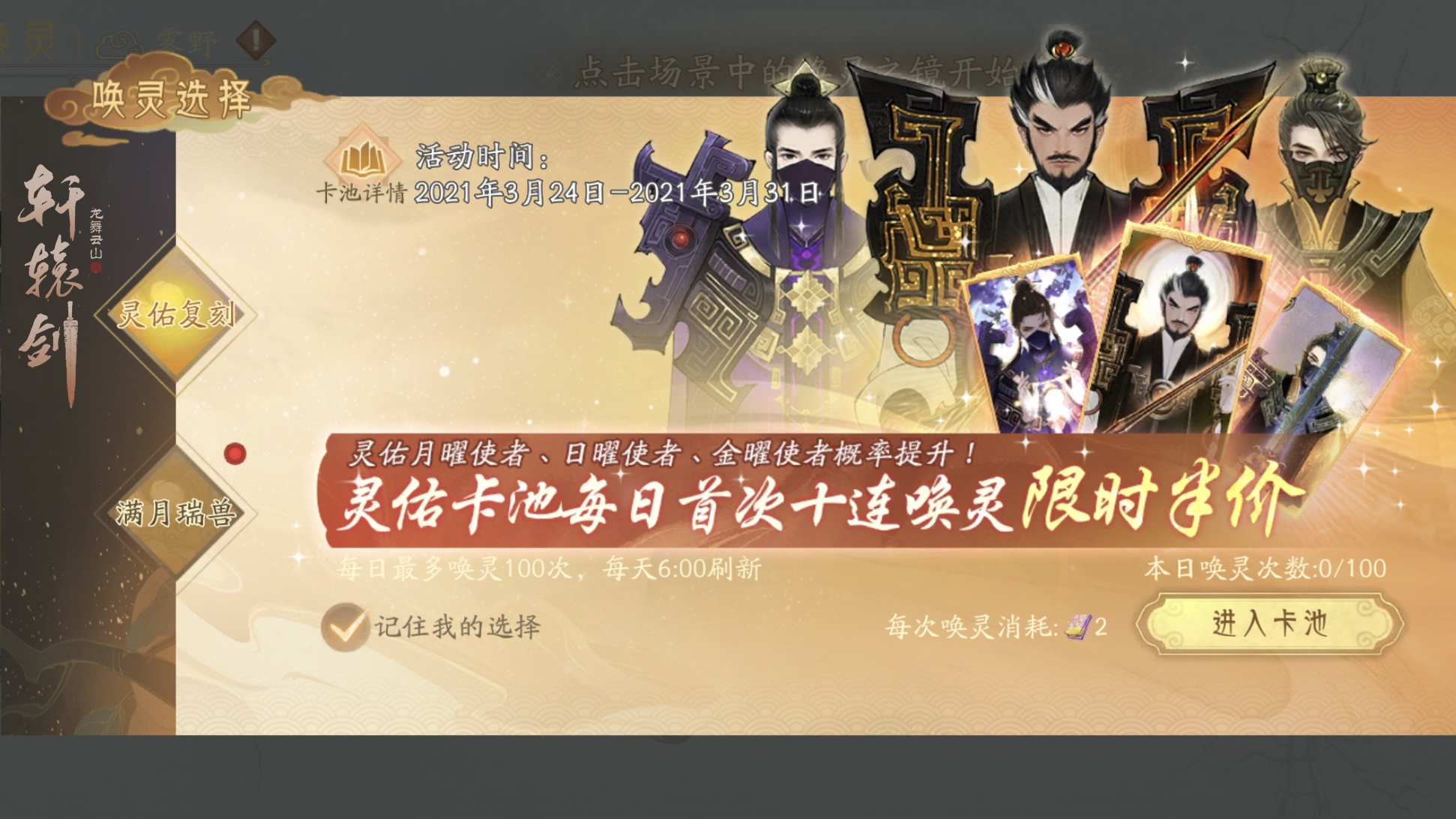 活动期间,《轩辕剑龙舞云山》三大无双灵佑“日曜使者”、“金曜使者”、“月曜使者”的出现概率将大幅提升!少侠何不趁此良机,一鼓作气提高实力!