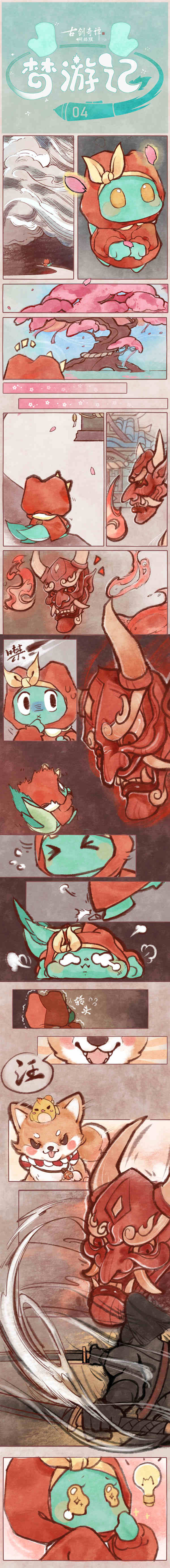 04被“白日梦唧炮”卷入到了一片虚无飘渺中,烟尘消散,竟有片片花瓣飘落,04随着落花,找到了这红粉绯樱所在之处,继而准备在矗立樱花树下的华美神社寻找创作灵感。但04靠近神社取材时,却遭到了恐怖的鬼面怪物袭击,幸好有英勇的柴犬和隐藏神社中的神秘人相救,04才成功脱险!