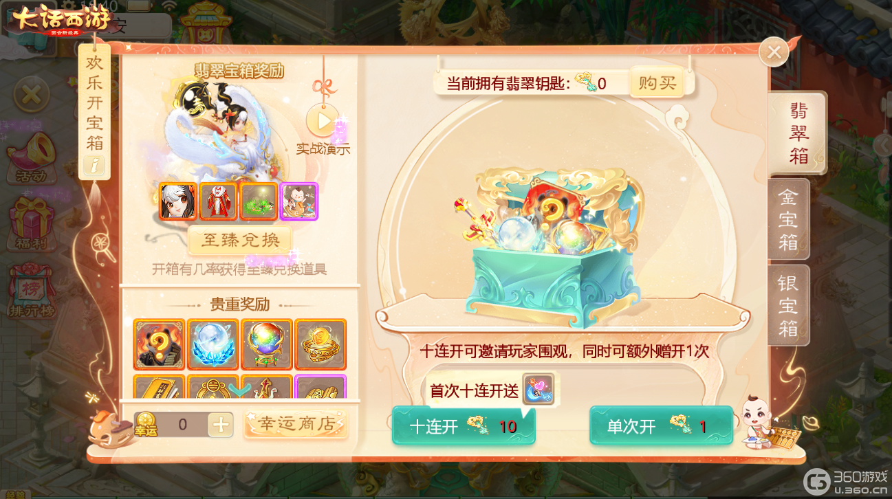玩家每次开启翡翠宝箱均有几率掉落至臻如意丹,可用于兑换绝版鎏金群攻珍宠——龙兔,绝版典藏时装——锦年,养育主题双场景演绎随身特效——两小无猜及养育空间装扮,还有几率掉落五常神兽及超级元气丹等稀世珍宝!首次十连开箱还将得到全新个性队标——童真!一定不要错过!