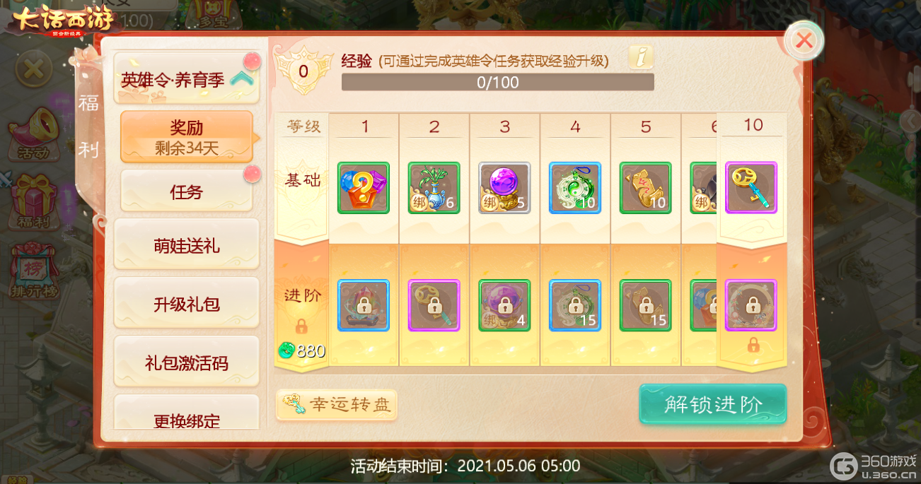 3月29日5点-5月3日5点期间将开启“养育季·英雄令”**,侠士通过完成日常**,参与养育**培养即可获取英雄令经验,为英雄令升级之后就能够获取丰厚的奖励。此外,侠士还可选择花费880仙玉解锁进阶英雄令奖励,花费1560仙玉不仅能解锁进阶英雄令还可以直升30级,立即获取海量奖励!