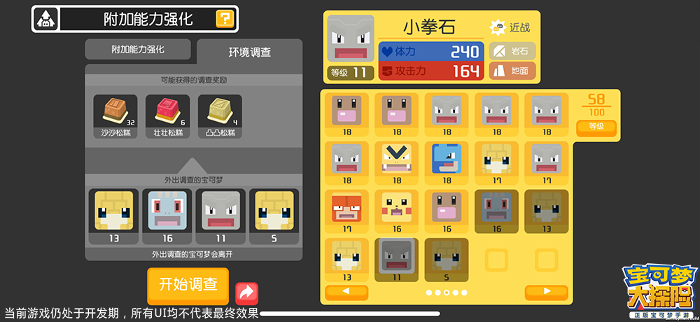 除了图鉴中累积研究等级可以获得松糕外,还可以通过附加能力强化中的环境调查获取,探险家派遣闲置的宝可梦外出调查后,便可根据宝可梦的等级、属性等获得松糕奖励。需要注意的是,完成环境调查的宝可梦也会离开营地。