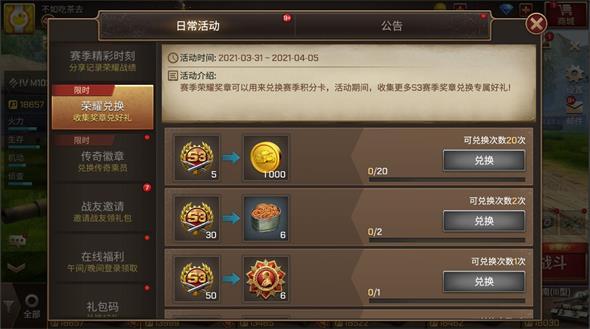 1、[S3赛季奖章]*5,兑换[金币]*1000(兑换限制次数:20次)