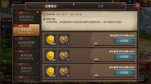 1、组队赢得任意模式战斗*1,[金币]*1000,[S3赛季奖章]*1