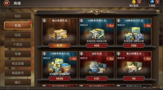 1、¥ 68赛季特惠礼包:钻石*600,金币*100000,空中支援*40,IV级配件宝箱*1