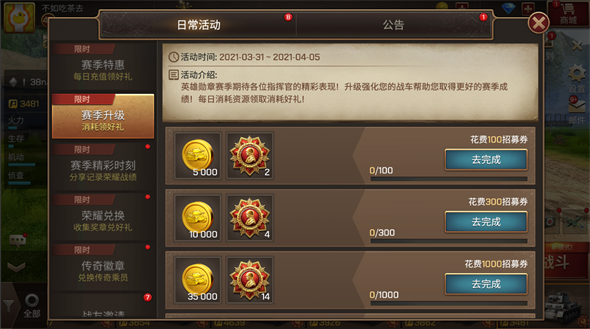 英雄勋章赛季期待各位指挥官的精彩表现!升级强化您的战车帮助您取得更好的赛季成绩!每日消耗资源领取消耗好礼!