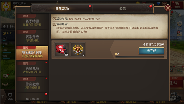 精彩时刻值得留念,分享荣耀战绩赢取分享好礼!活动期间每日分享坦克车群或战绩截图,向好友炫耀您的实力!